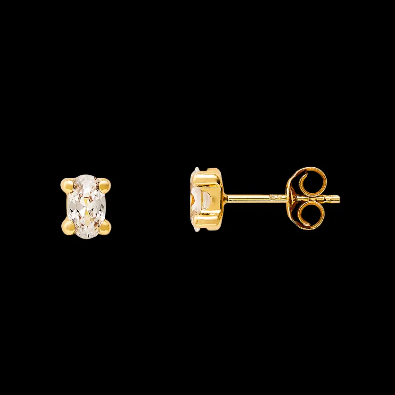 Diese zarten Ohrstecker aus 9-karätigem Echtgold mit weißen Zirkonia-Steinen sind ein sportlich, eleganter Basic-Ohrsc…