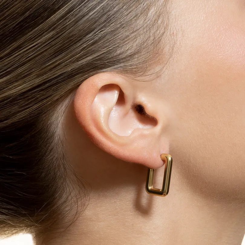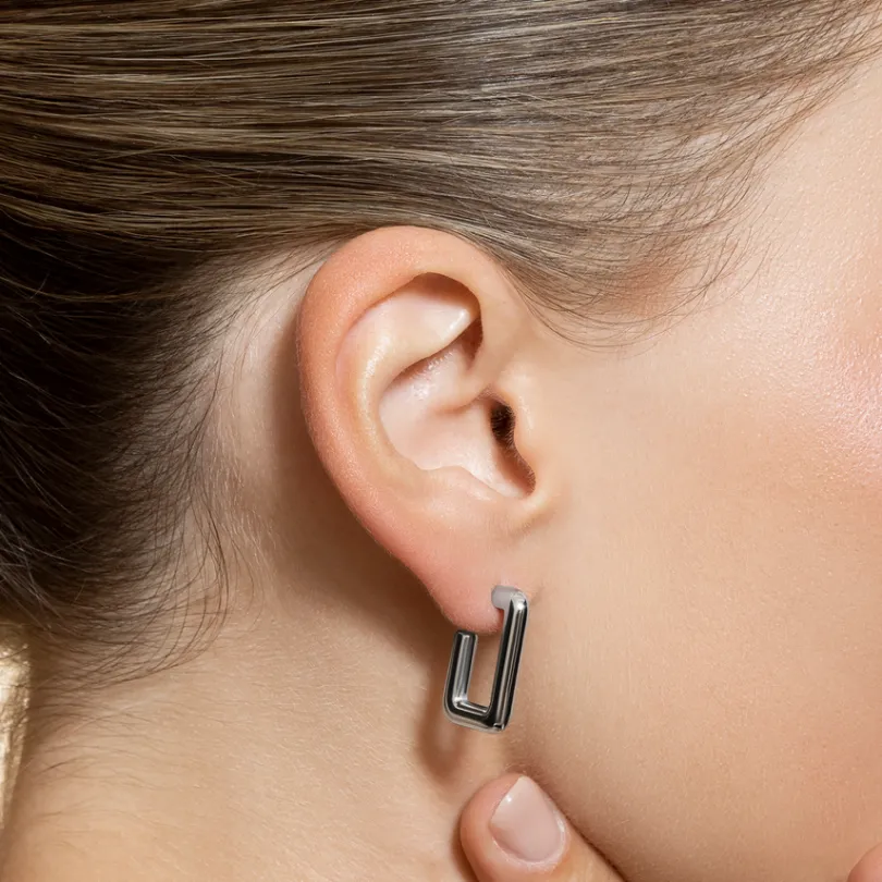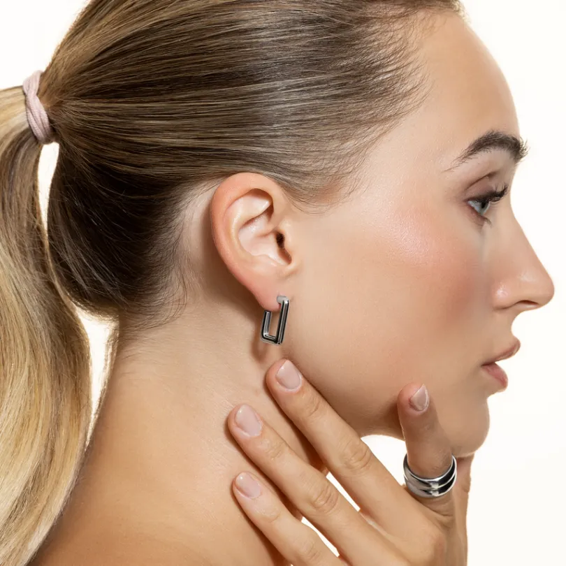 Unsere FRAME Creolen aus Edelstahl vereinen moderne Geometrie mit eleganter Schlichtheit. Die Ohrringe, gefertigt aus ho…