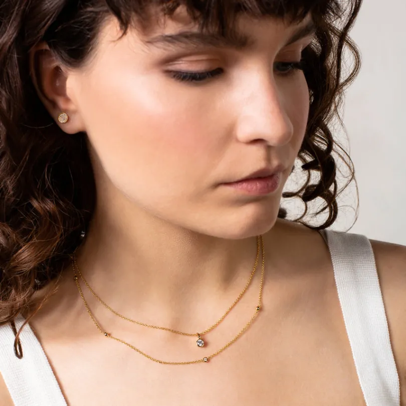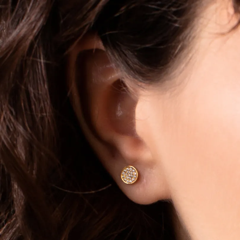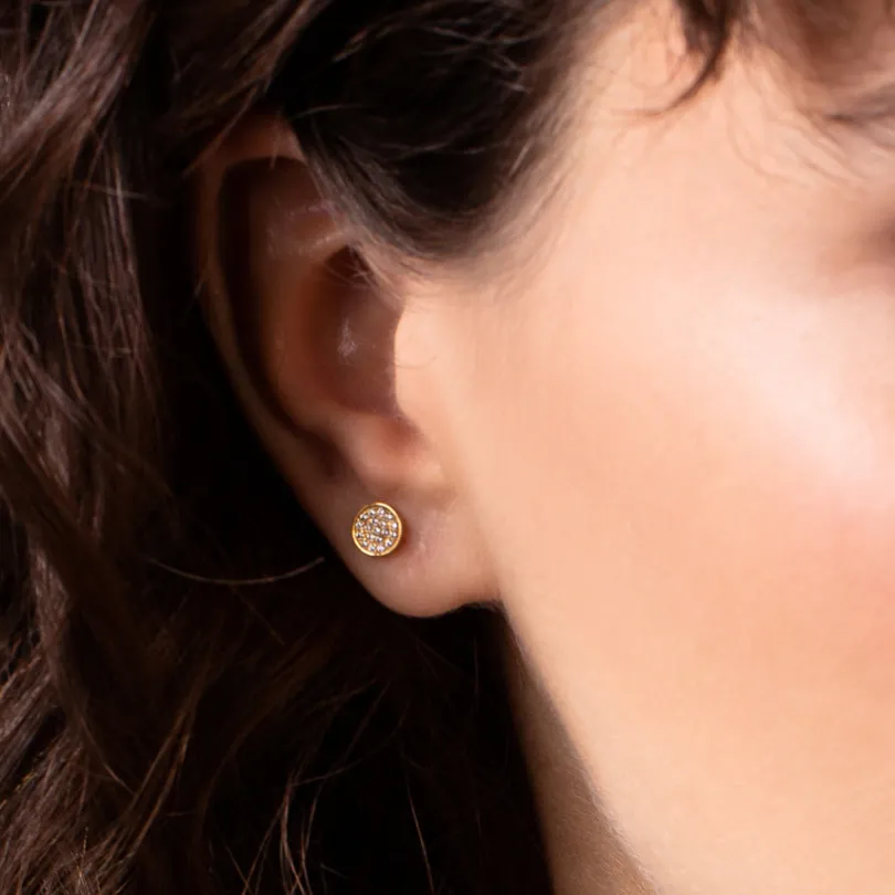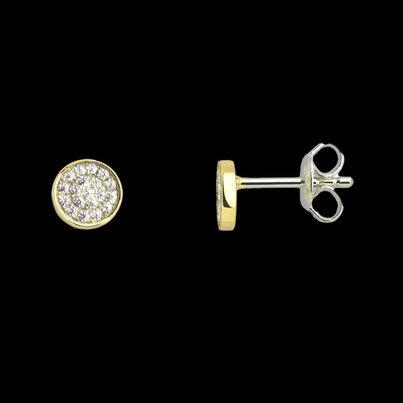 Viele kleine Zirkonia Steine funkeln hell auf diesem kreisrunden Ohrstecker aus 18 Karat vergoldetem 925/- Sterlingsilbe…